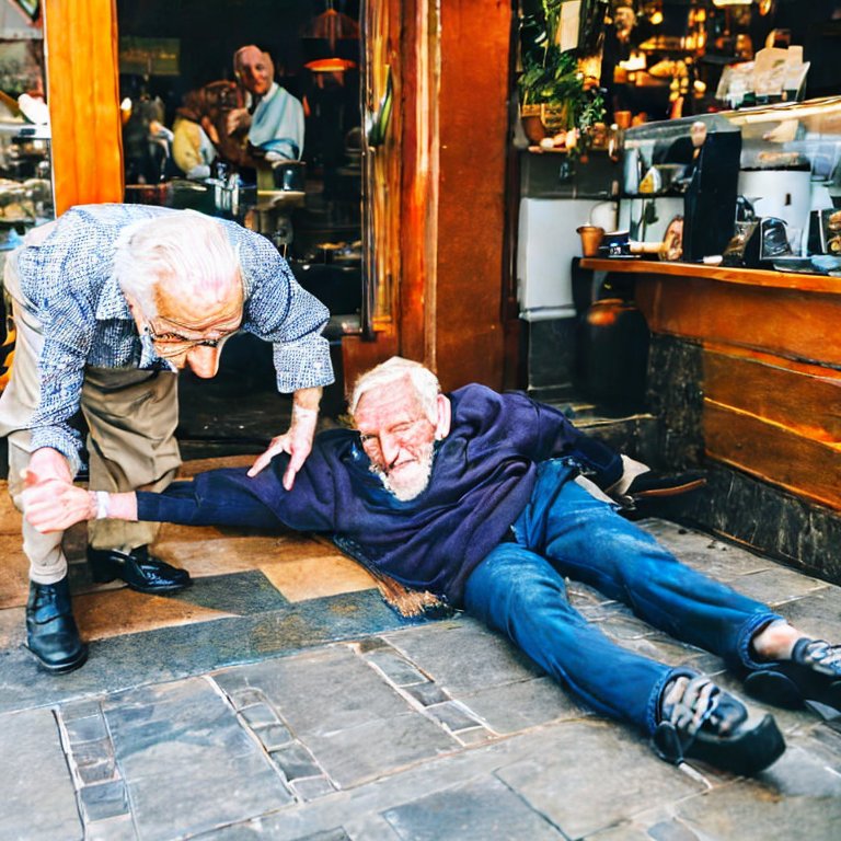 Ambulansepersonell kommer stormende inn i konditoriet og skynder seg til bordet der de to eldre mennene sitter. De undersøker Arne og finner ut at han har hatt et hjerteinfarkt. De gir ham øyeblikkelig behandling og plasserer ham på en båre for å ta ham med til sykehuset.